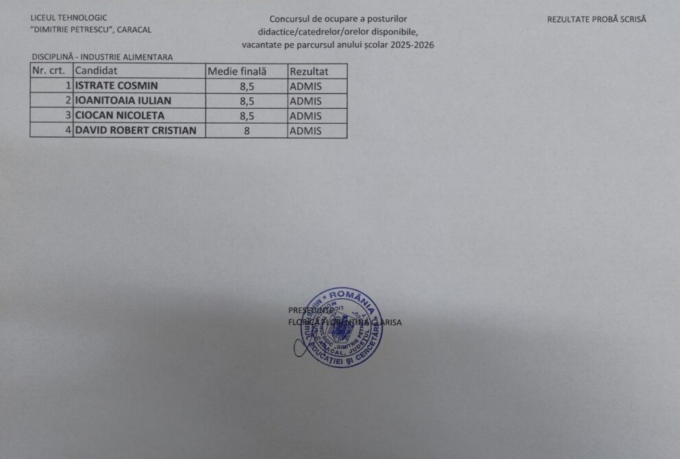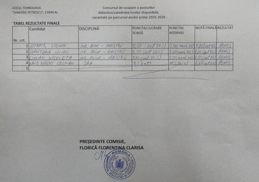Rezultate finale concurs ocupare posturi vacante 2025-2026 (necalificati)